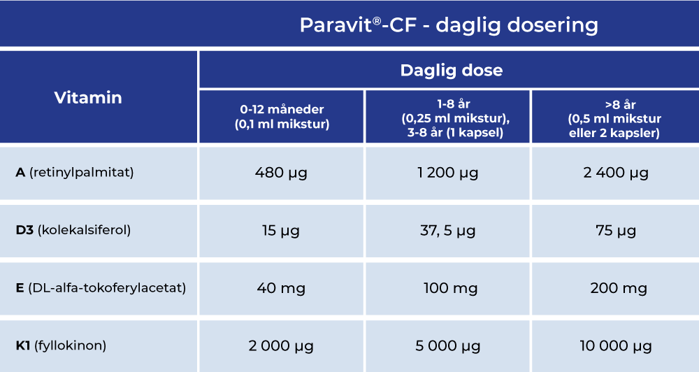Den anbefalte daglige dosen av Paravit®-CF er basert på tilbakemeldinger fra helsepersonell om tilskudd av fettløselige vitaminer. Den daglige dosen av Paravit-CF følger europeiske retningslinjer (ESPEN 2016).